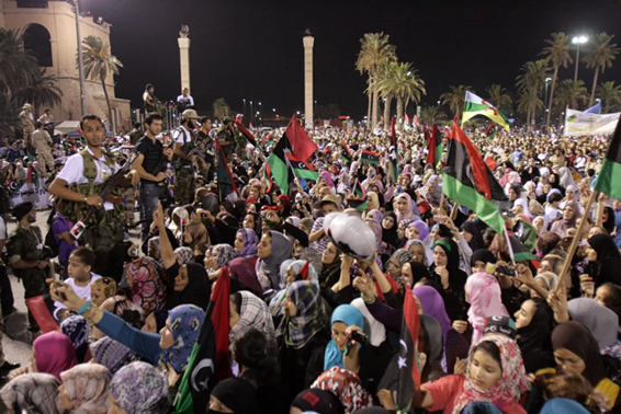 Figura 3 - Foto de 13 de setembro de 2011 mostra manifestantes celebrando a queda de Muamar Khadafi, ditador da Líbia retirado durante a Primavera Árabe — Foto: Mahmud Turkia/AFP.