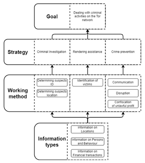 Fonte: Emmen, Poot e Stol, 2023 Imagem obtida do artigo What are they doing in the dark, que apresenta o objetivo, estratégias, métodos de trabalho e os tipos de informação referentes a atuação da polícia Holandesa na rede Tor.